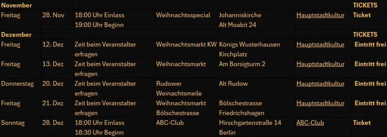 | Freitag | 28. November | !8:00 Uhr Einlass/19:00 Uhr Beginn | Weihnachtsspecial | Johanniskirche, Alt Moabit 24 | Hauptstadtkultur | Ticket |